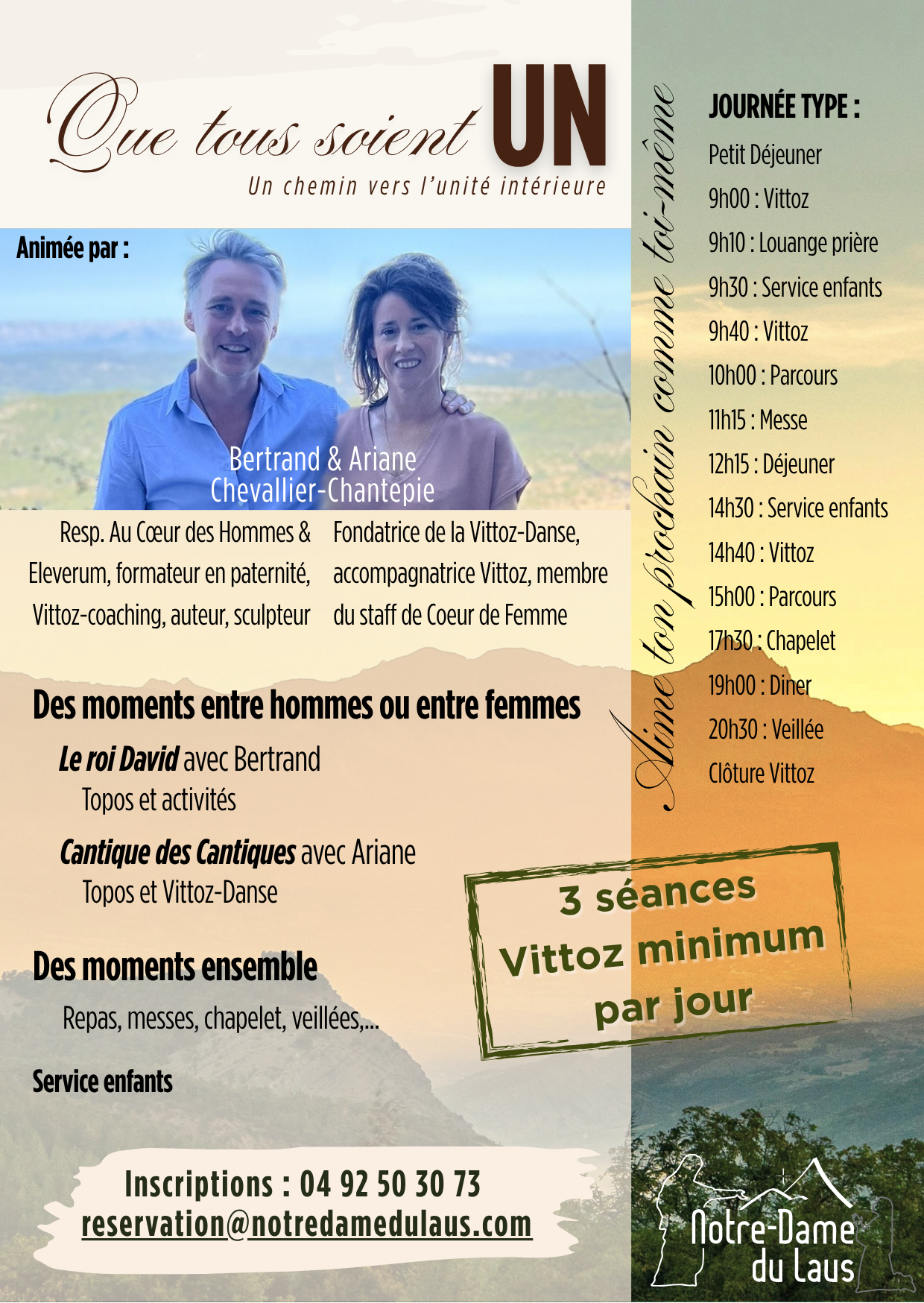 Vittoz intensif, temps présent, repos, et aussi intégration de son identité d’homme ou de femme sur des thématiques masculines et féminines. Objectif ? être unifié, en paix avec soi-même. Faciliter les relations interpersonnelles et oser la vie.